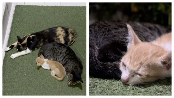 直到一週後,大貓也習慣了小貓的存在,不再對牠嘶吼或想要伸爪子。現在兩隻大貓跟這隻小貓已經可以睡在一起,一起玩,我看在眼裡就覺得像大哥大姐姐帶小朋友一樣。