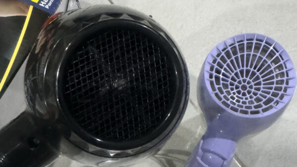 (左邊是新的吹風機,當我拿出來使用後才注意到後面有網子,不會捲進我的頭髮,右邊舊的吹風機則是通到風扇,所以會捲入頭髮)